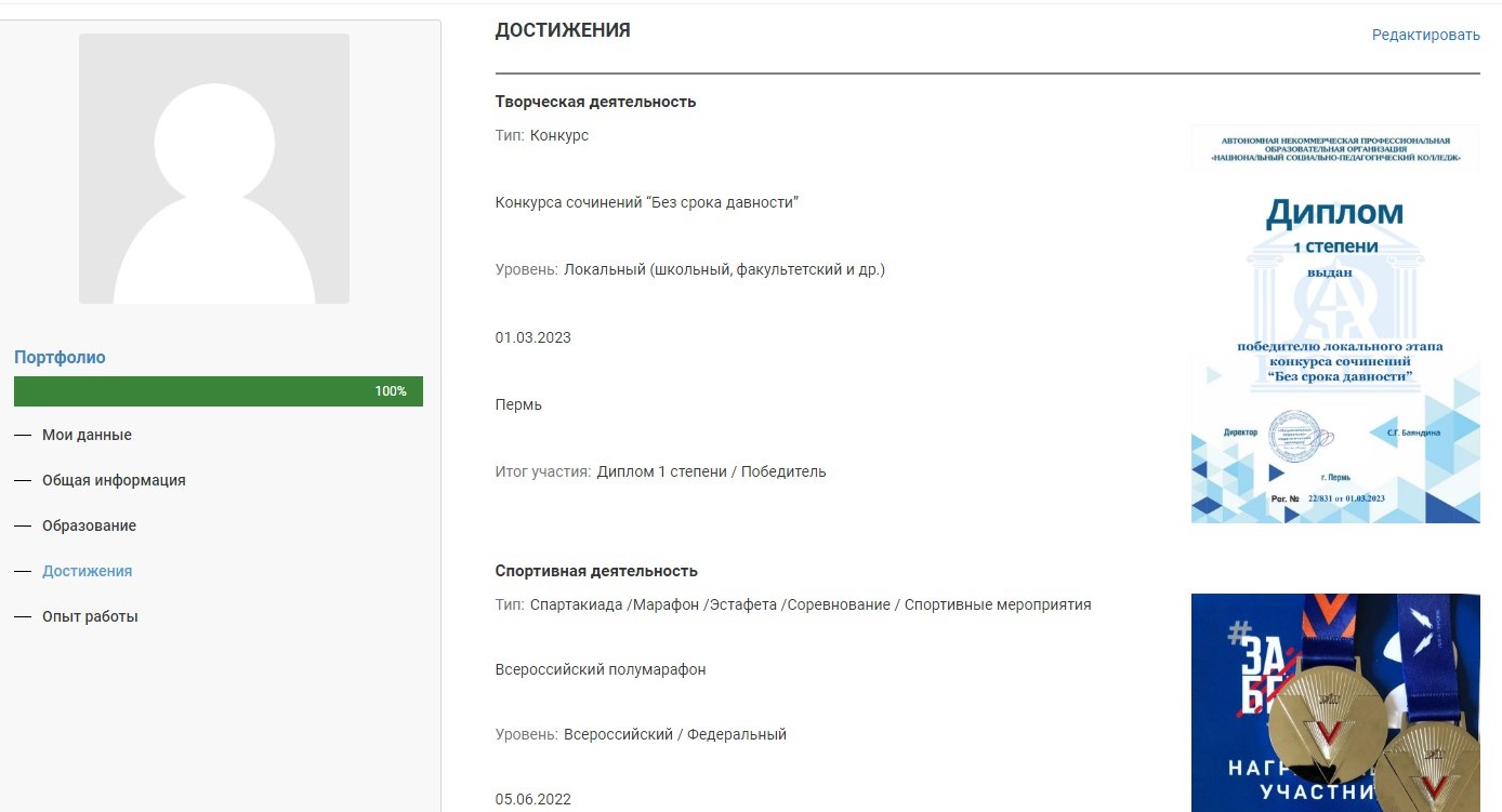 Такое полное портфолио покажет профессионализм, полученные навыки и компетенции, поможет при устройстве на работу — работодатели ценят активных сотрудников с опытом работы и участия в конкурсах, конференциях и других мероприятиях.